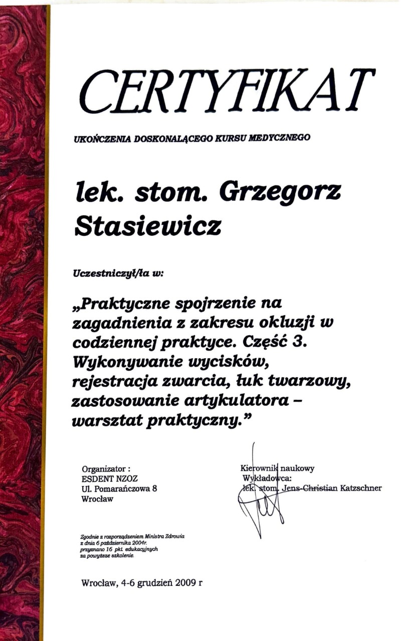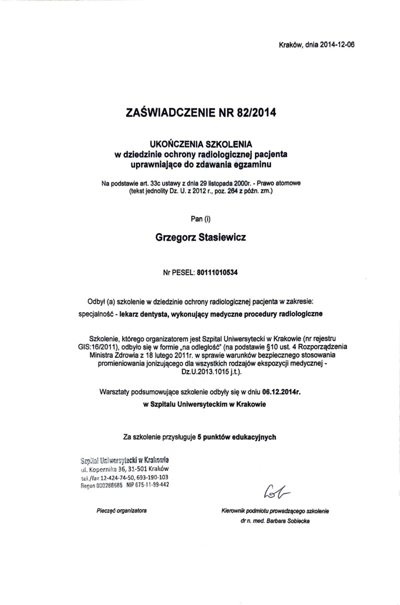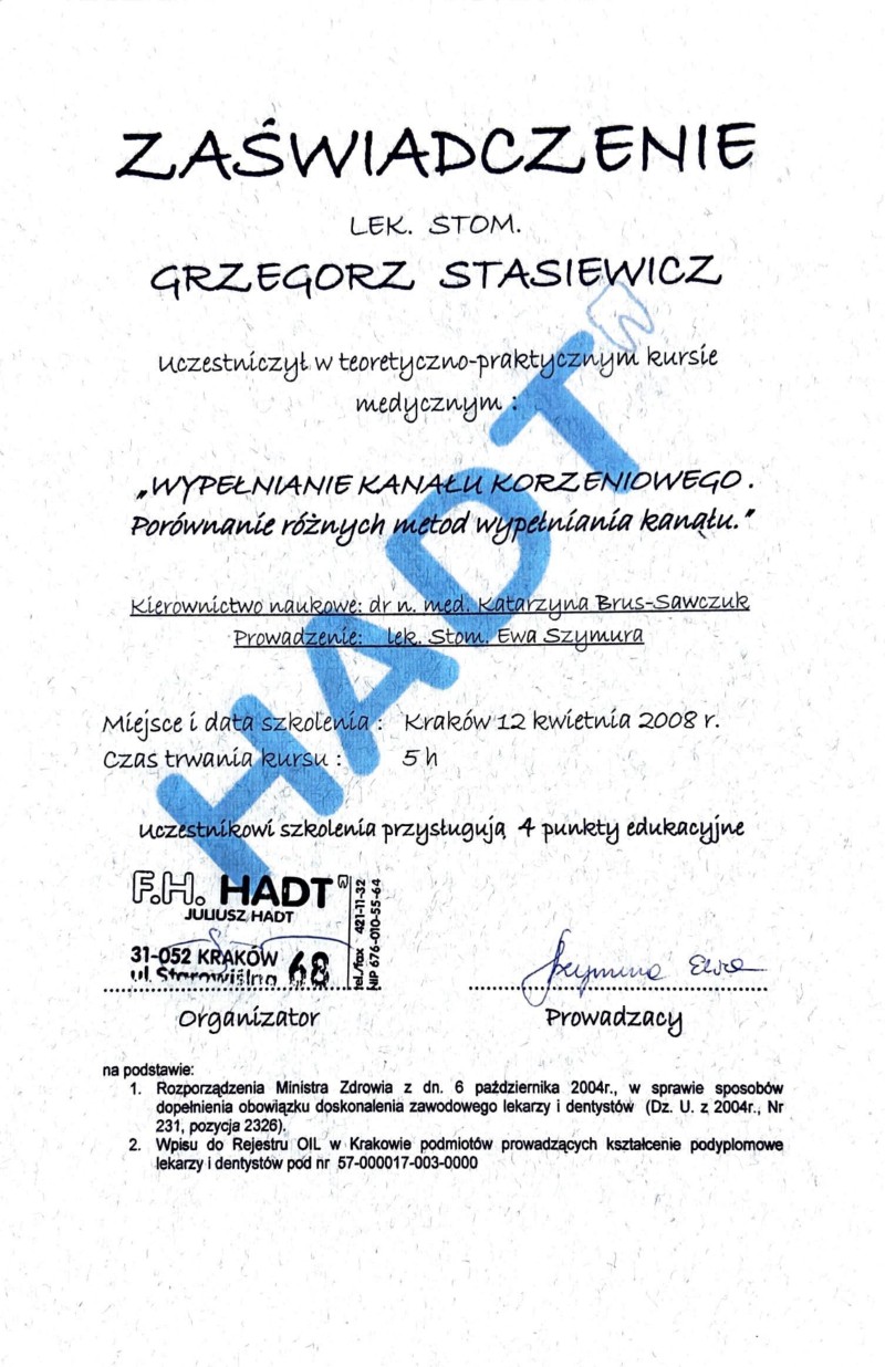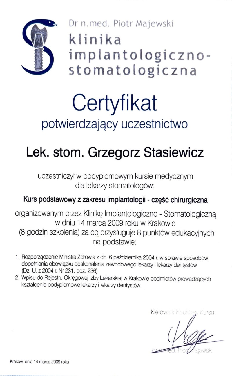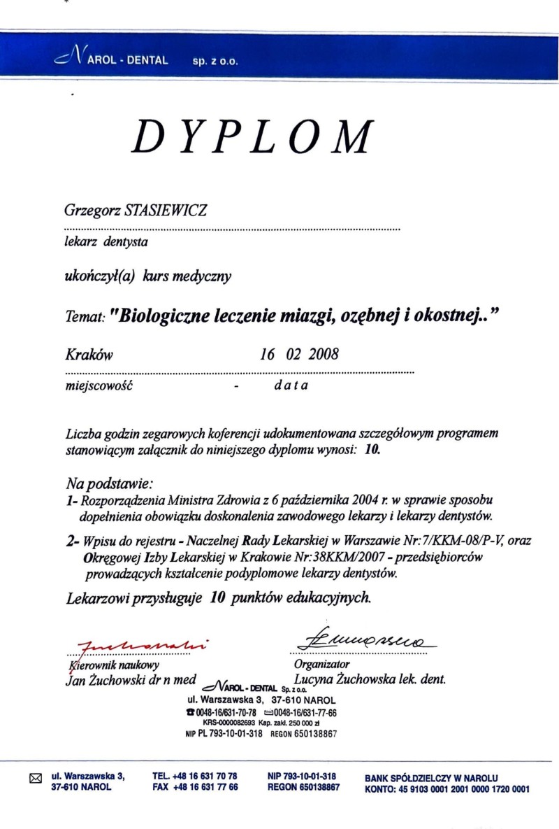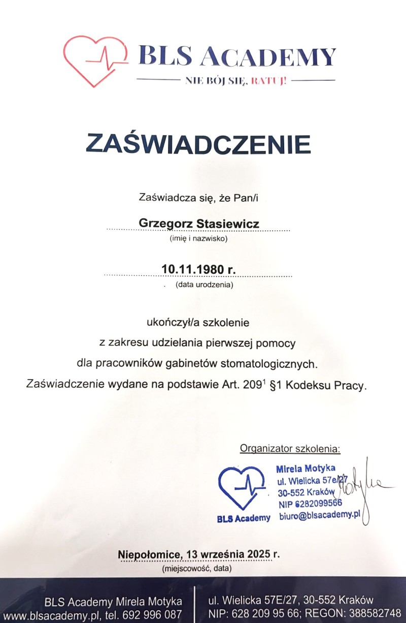 Absolwent Oddziału Stomatologii Wydziału Lekarskiego Collegium Medicum Uniwersytetu Jagiellońskiego w Krakowie 2008r.
