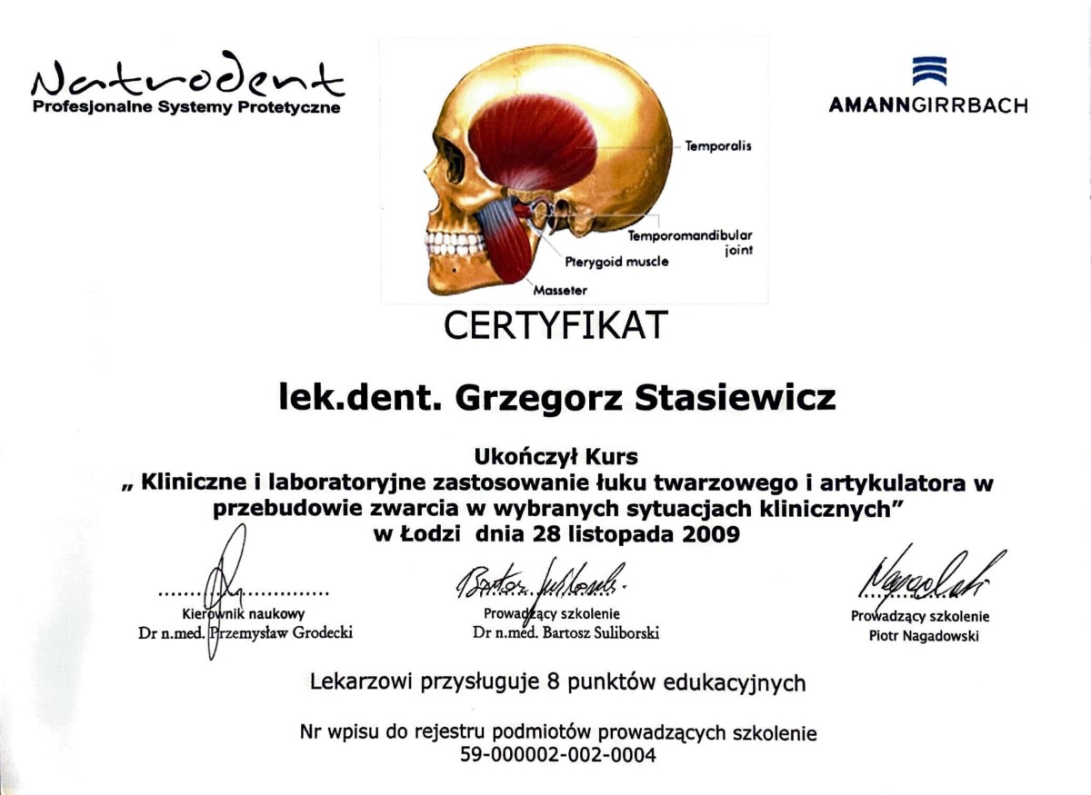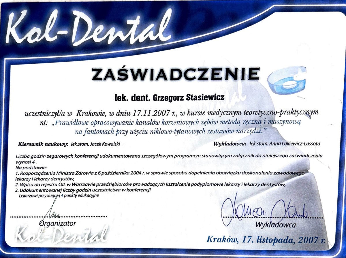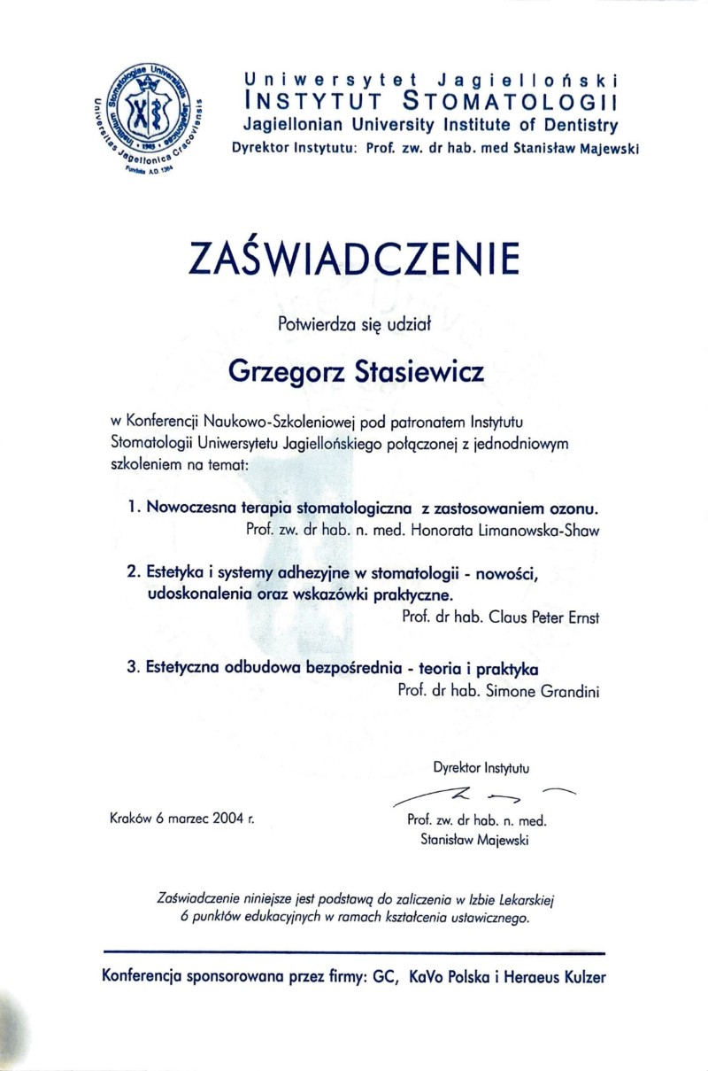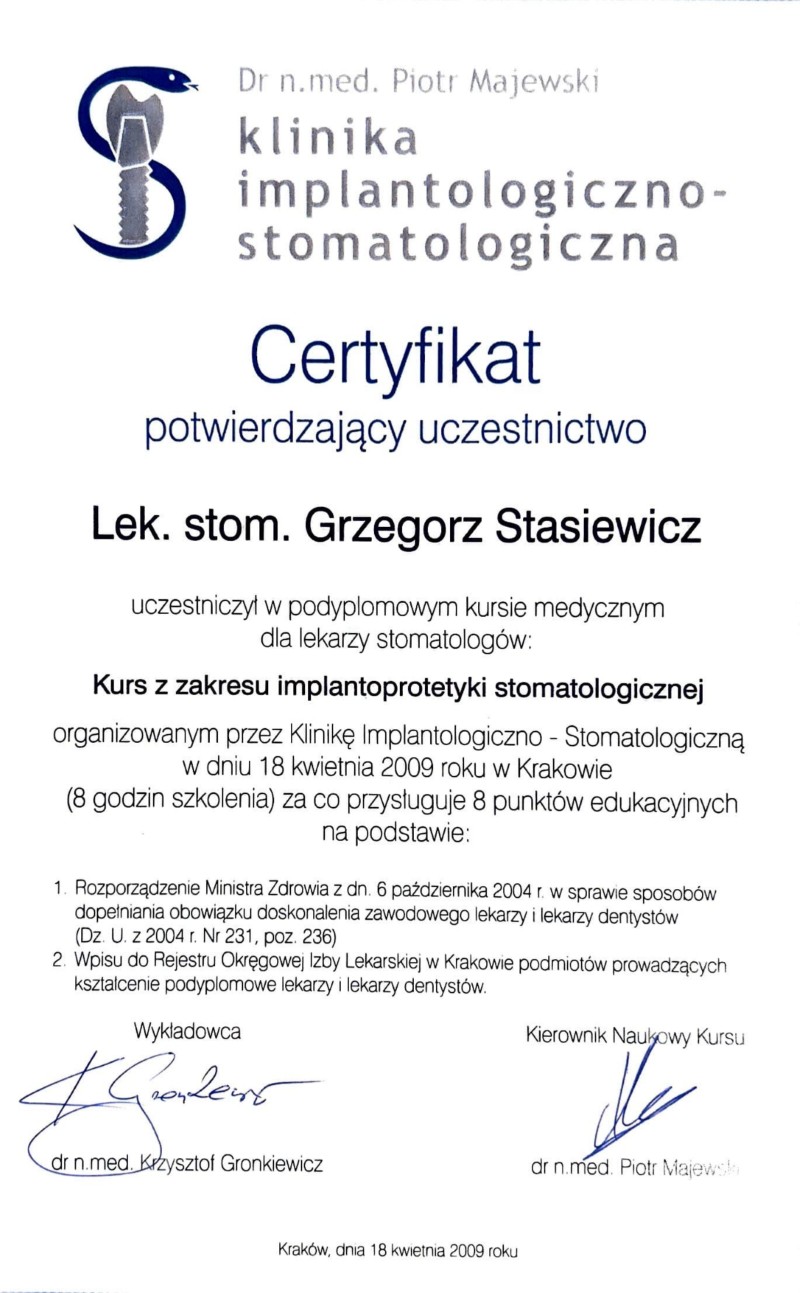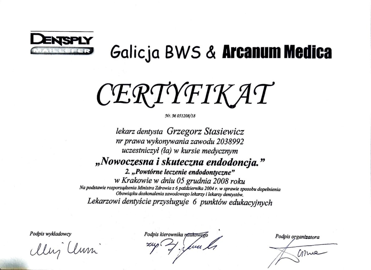 Absolwent Oddziału Stomatologii Wydziału Lekarskiego Collegium Medicum Uniwersytetu Jagiellońskiego w Krakowie 2008r.