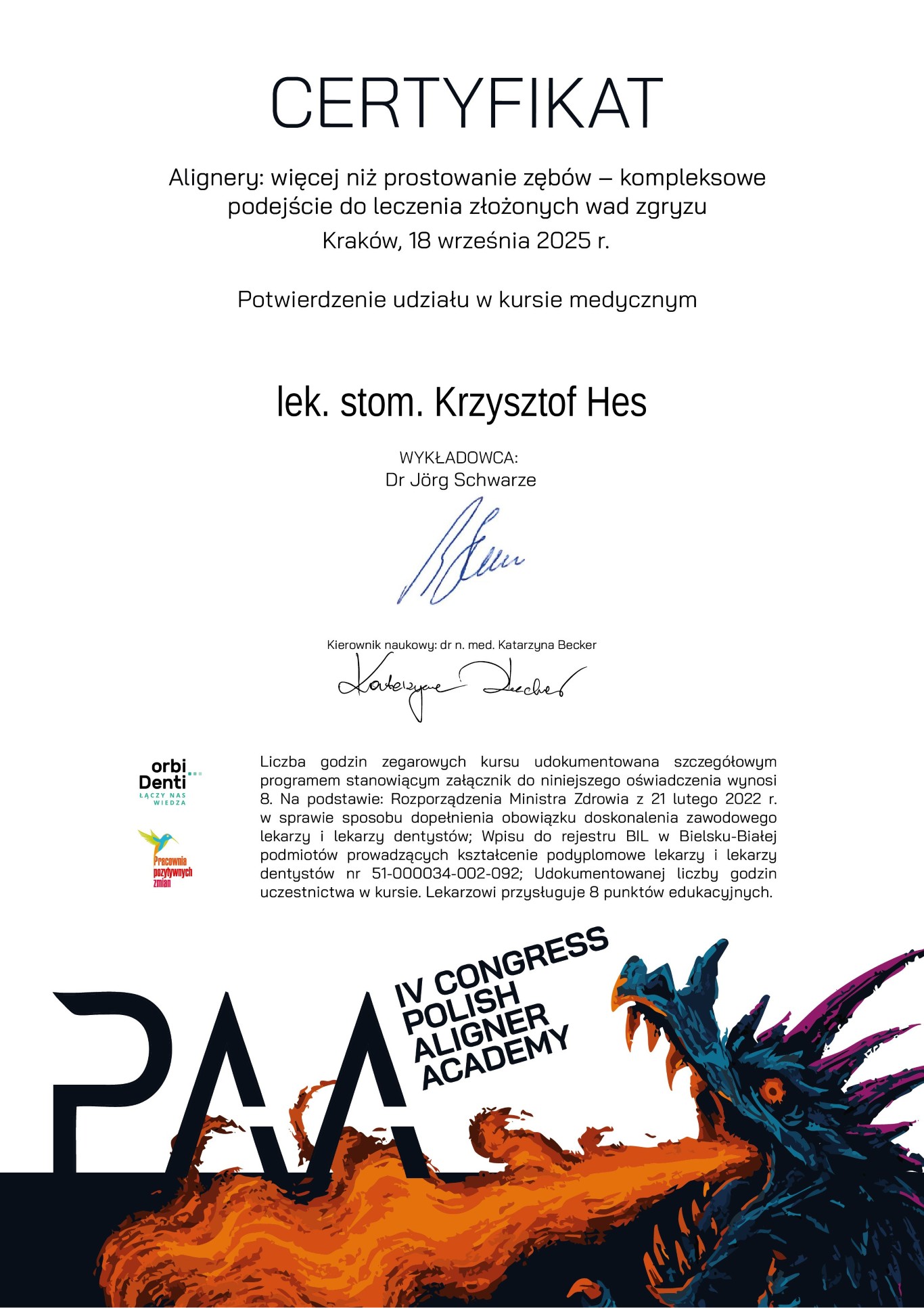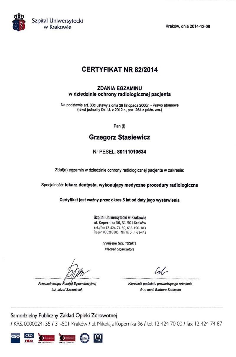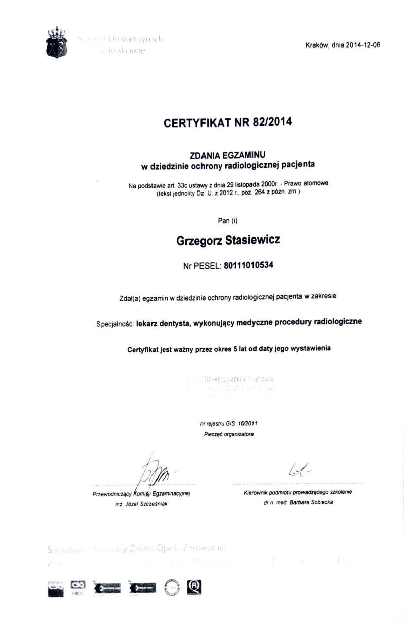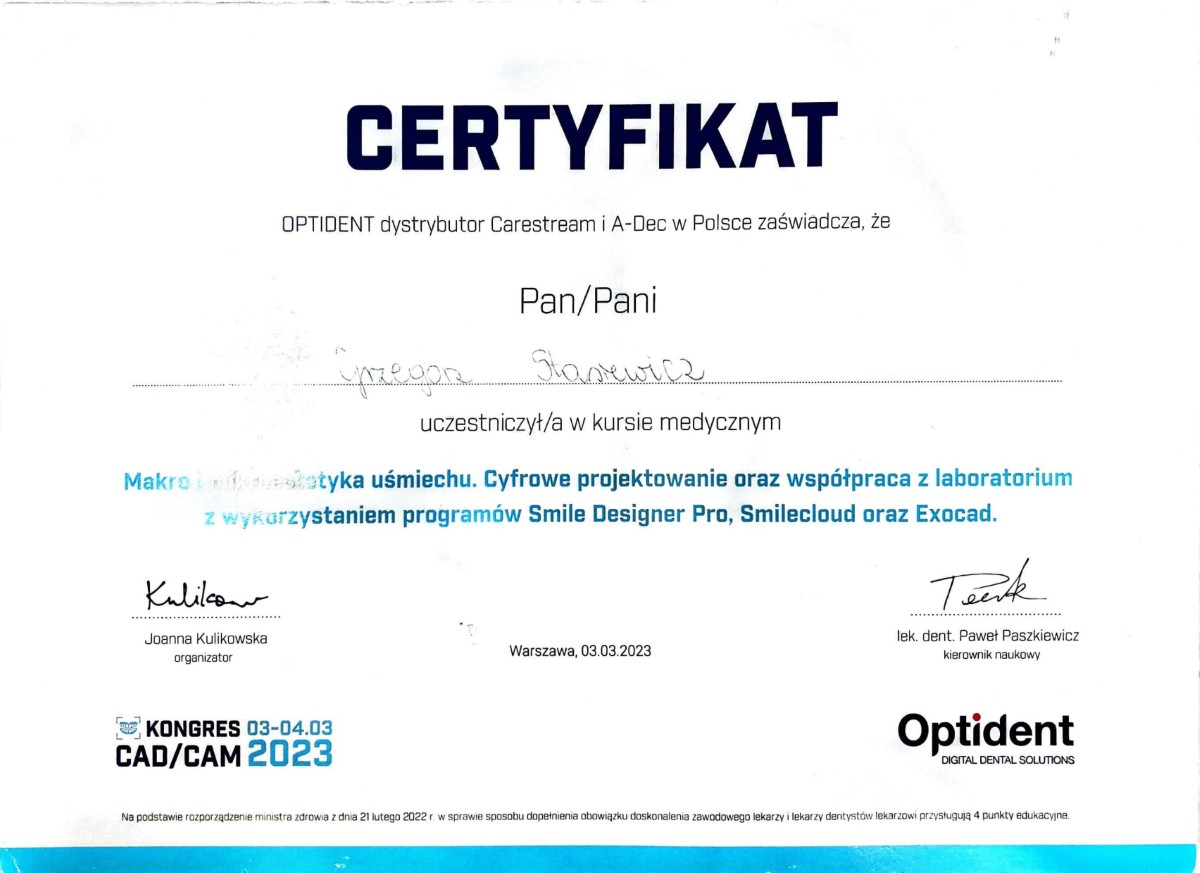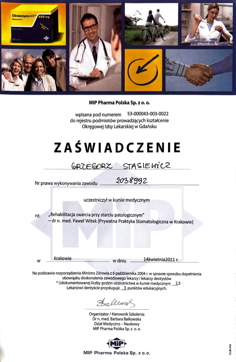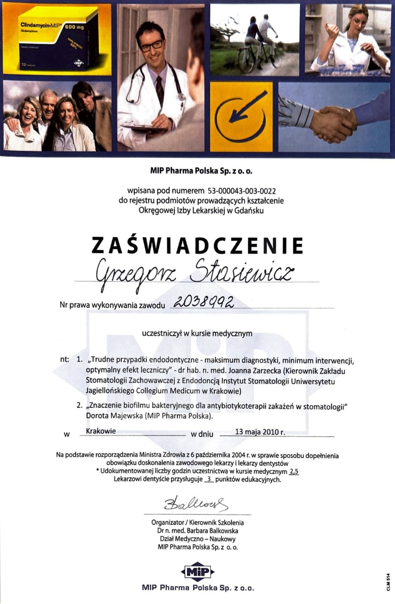 Absolwent Oddziału Stomatologii Wydziału Lekarskiego Collegium Medicum Uniwersytetu Jagiellońskiego w Krakowie 2008r.