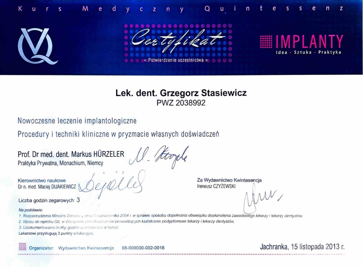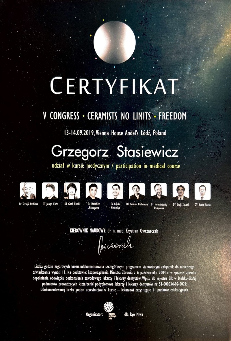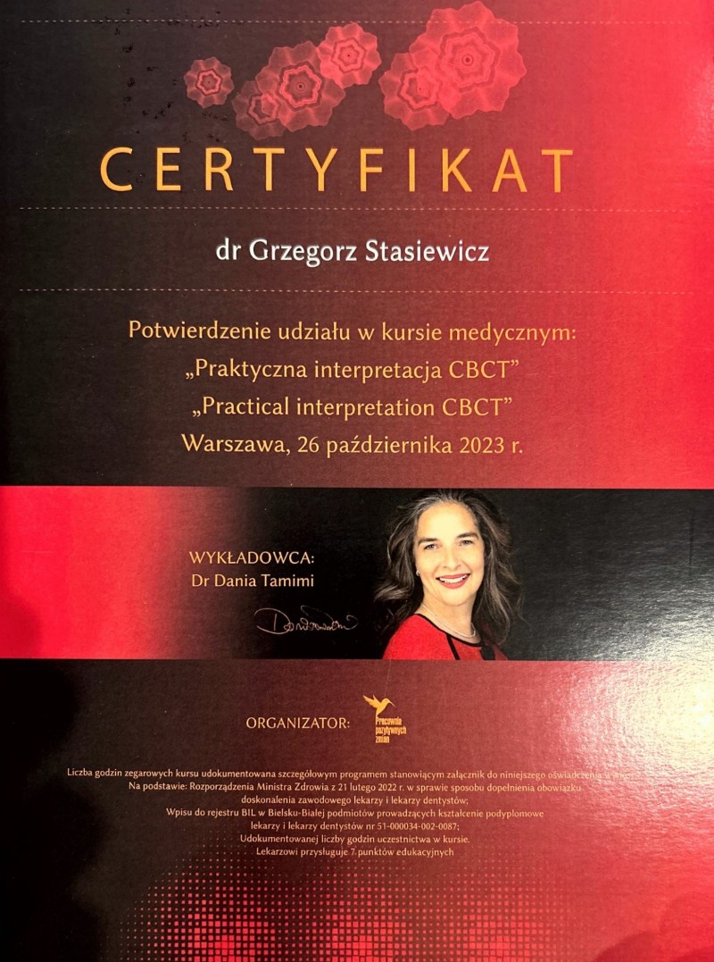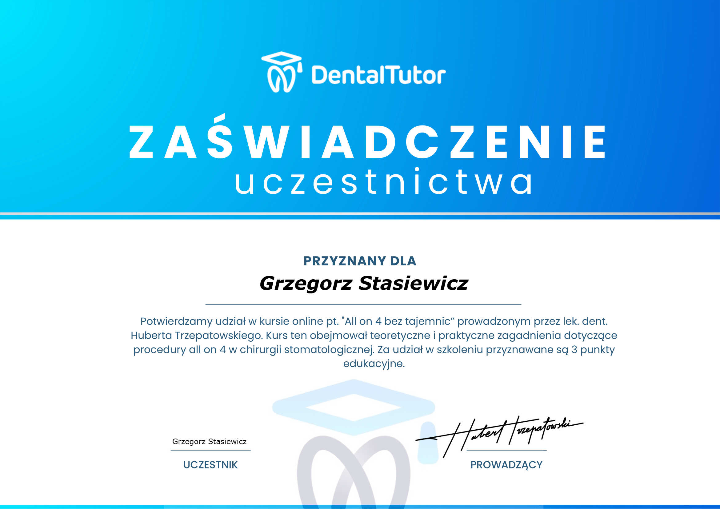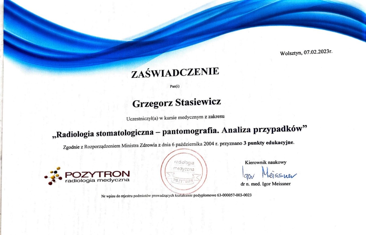 Jestem członkiem towarzystw chirurgii stomatologicznej oraz wielu grup dyskusyjnych zrzeszających chirurgów stomatologicznych, pozwalających na bieżąco aktualizować najwyższe standardy w chirurgii jamy ustnej.