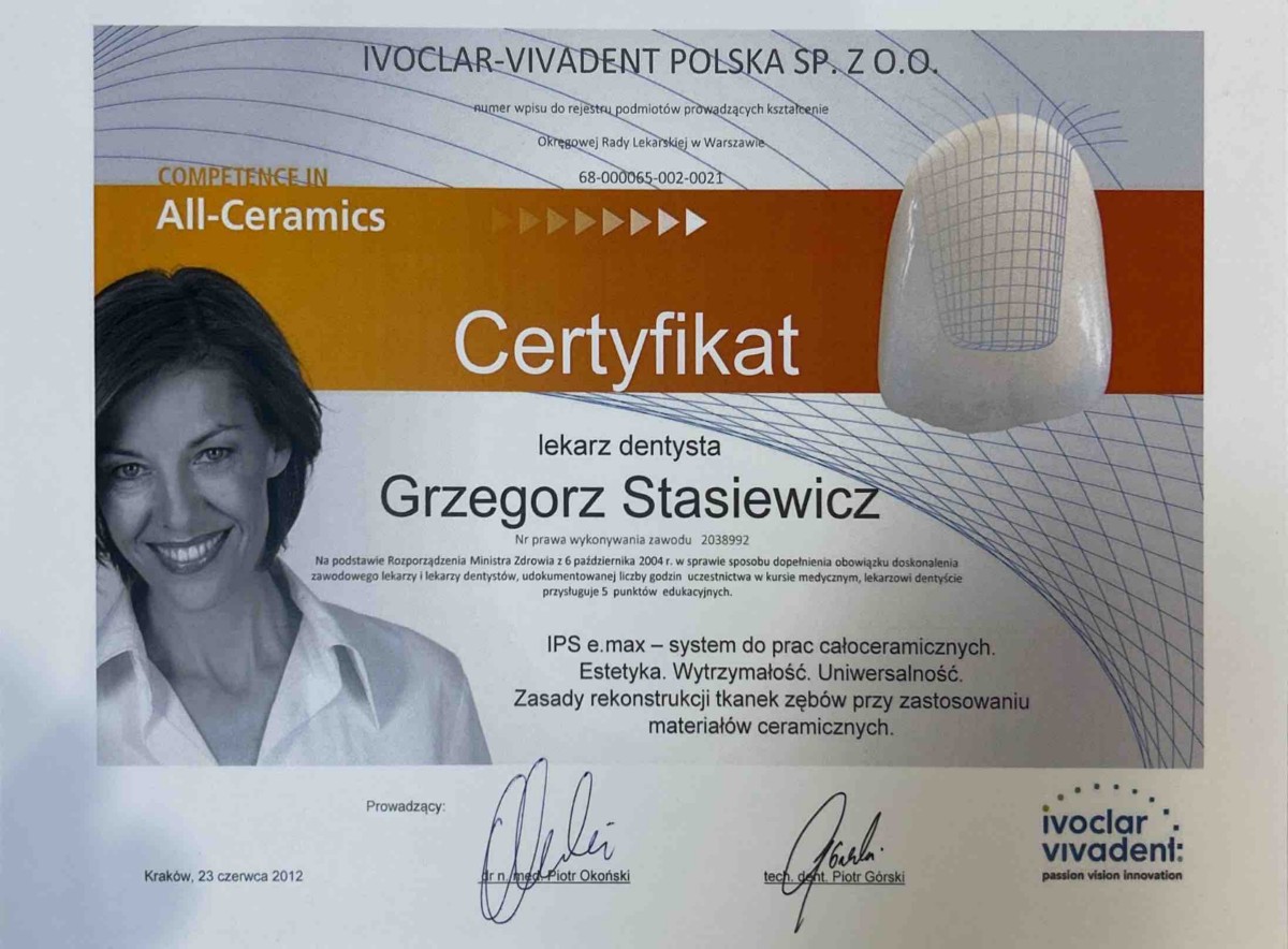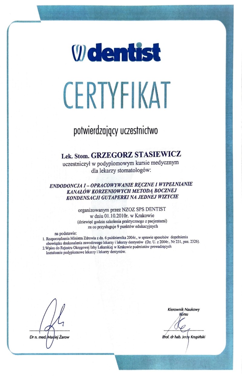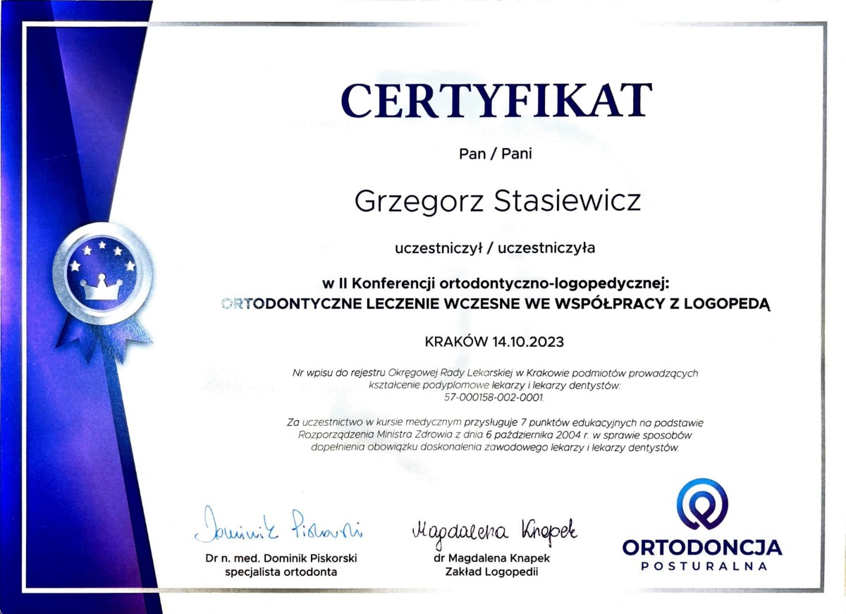 Specjalizację z zakresu Ortodoncji odbyłem w Wojewódzkiej Przychodni Specjalistycznej w Krakowie. Jestem członkiem Małopolskiego Koła Ortodontycznego, Polskiego Towarzystwa Ortodontycznego oraz Europejskiego Towarzystwa Ortodontycznego.