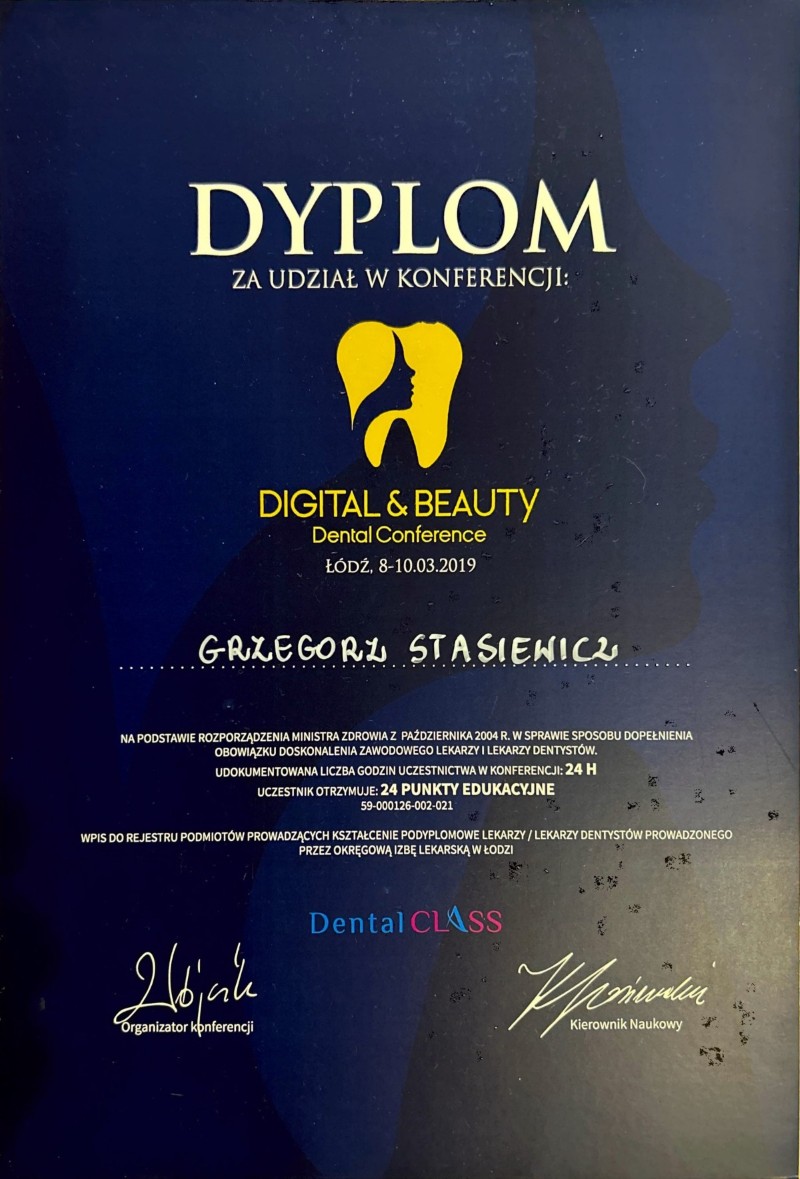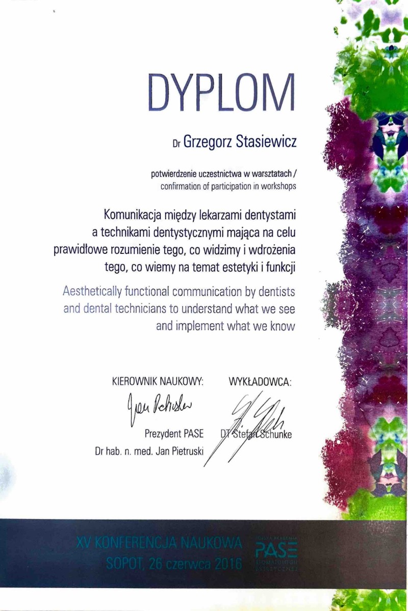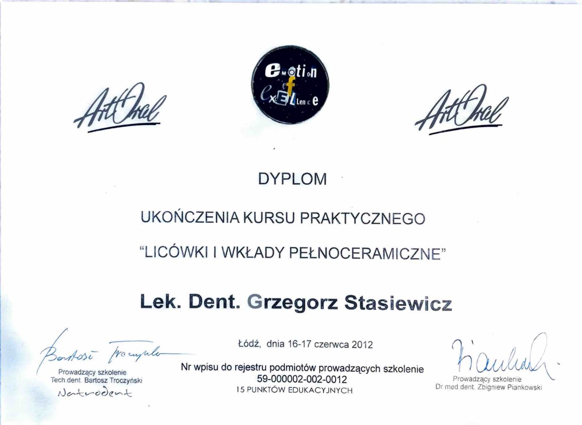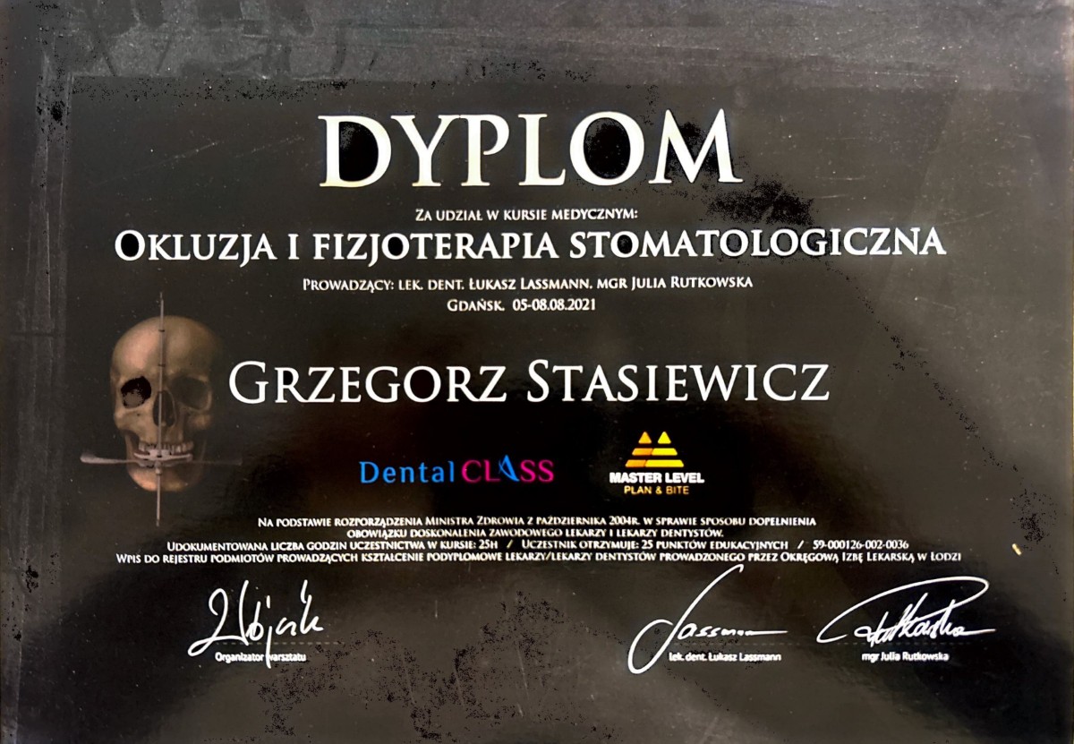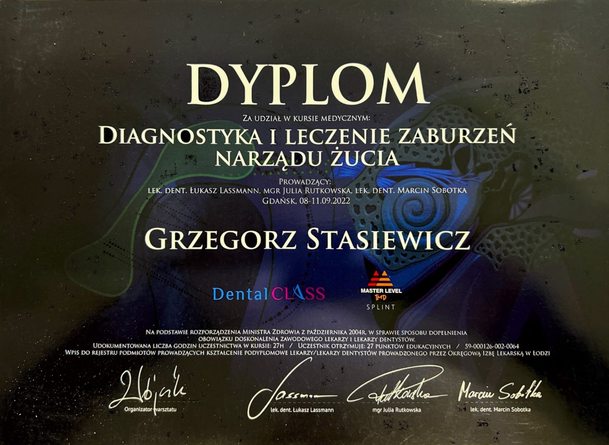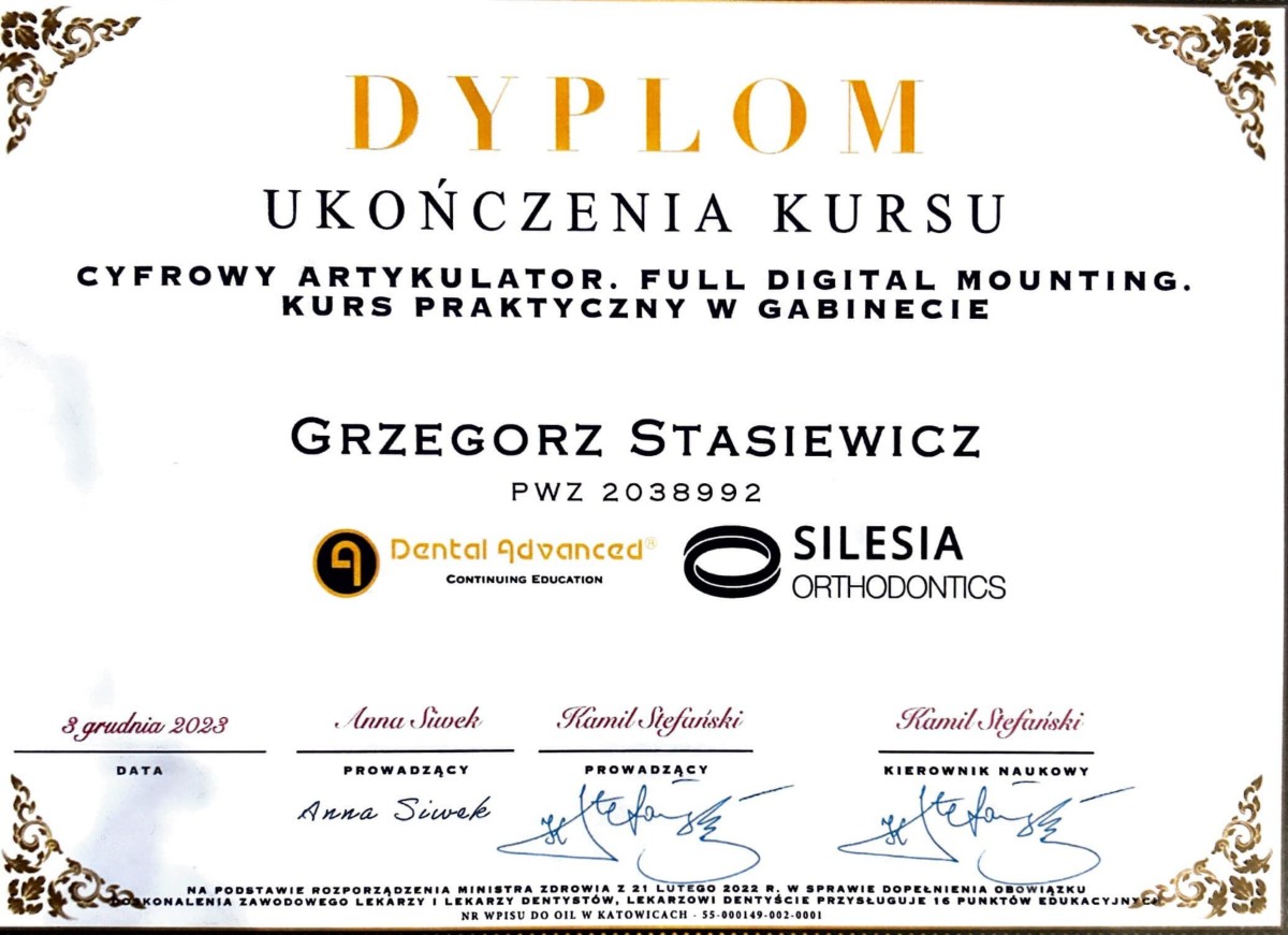 W 2018 roku uzyskał dyplom specjalisty w zakresie chirurgii stomatologicznej. Stale podnosi swoje kwalifikacje.